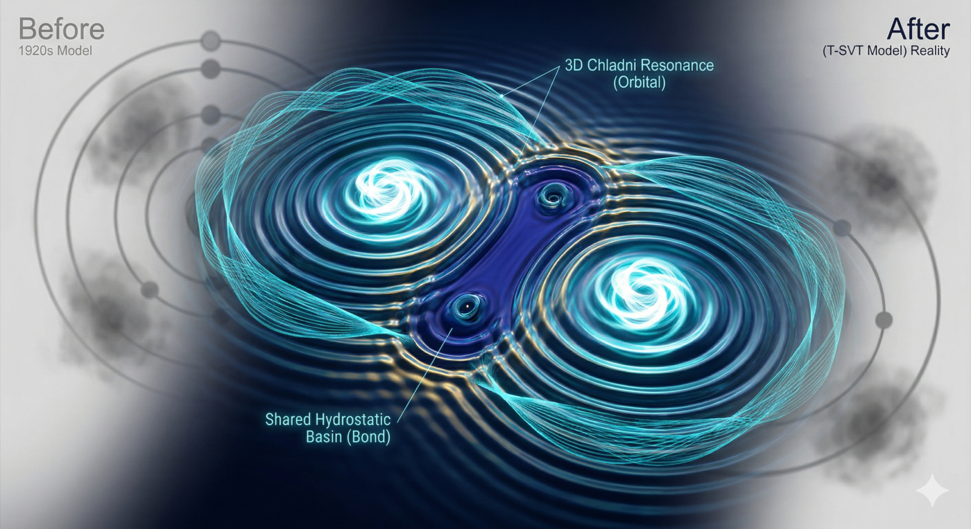 If we apply the T-SVT framework to chemistry, we must fundamentally rewrite how we visualize molecules. For the last century, chemistry has been ruled by the “electron cloud” model—a probabilistic haze of orbitals (s, p, d, f) where electrons magically teleport around a nucleus, bound by invisible electromagnetic forces.